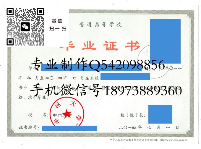 中州大学2014年毕业证样本