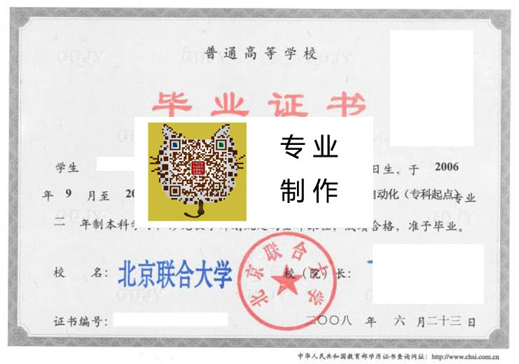 北京联合大学2008年毕业证样本